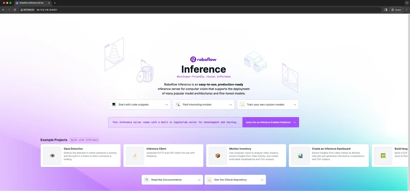 - The url for the inference server endpoint (http://34.66.106.65:9001); Visiting that link should open the Roboflow Inference server endpoint like shown below: