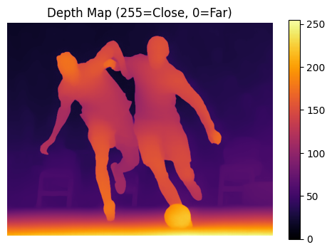 - Analyzes depth information. The depth map uses values where 255 = closest and 0 = farthest from camera.