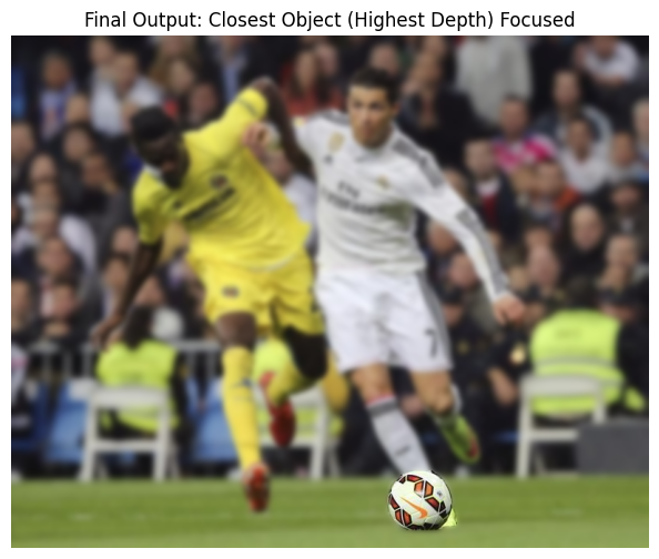 plt.title("Final Output: Closest Object (Highest Depth) Focused")