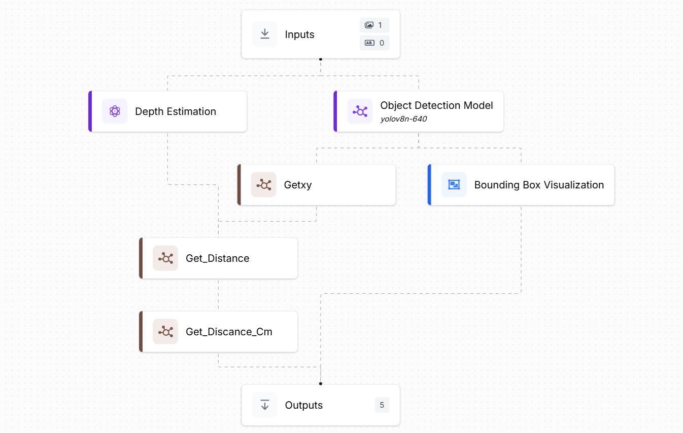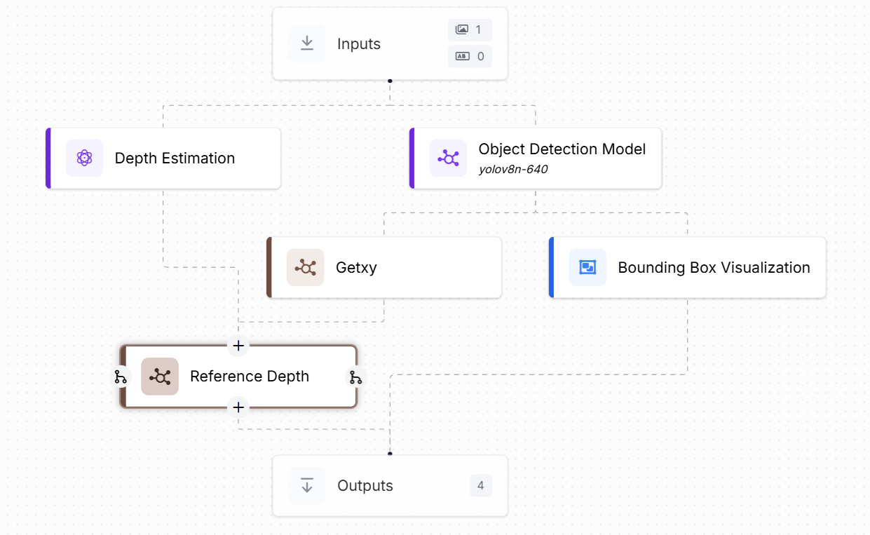 This workflow is designed to calculate the reference depth of an object (e.g., a bottle) placed at a known real-world distance from the camera. It combines object detection and depth estimation, with two custom code blocks to extract the center of the object and look up the corresponding depth value.