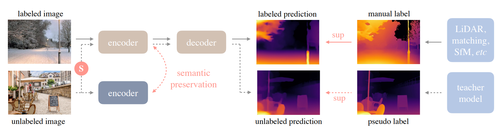 Stage 2 Pseudo-label Generation: This stage use the trained teacher on unlabeled real images (~62 million). It automatically generate pseudo-ground-truth depth maps to mitigate synthetic-to-real domain shift.