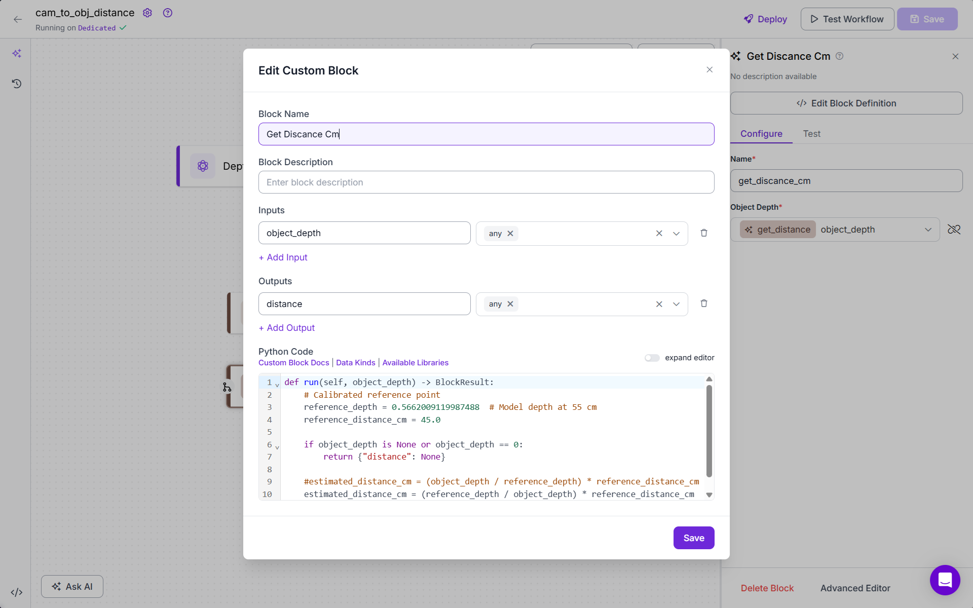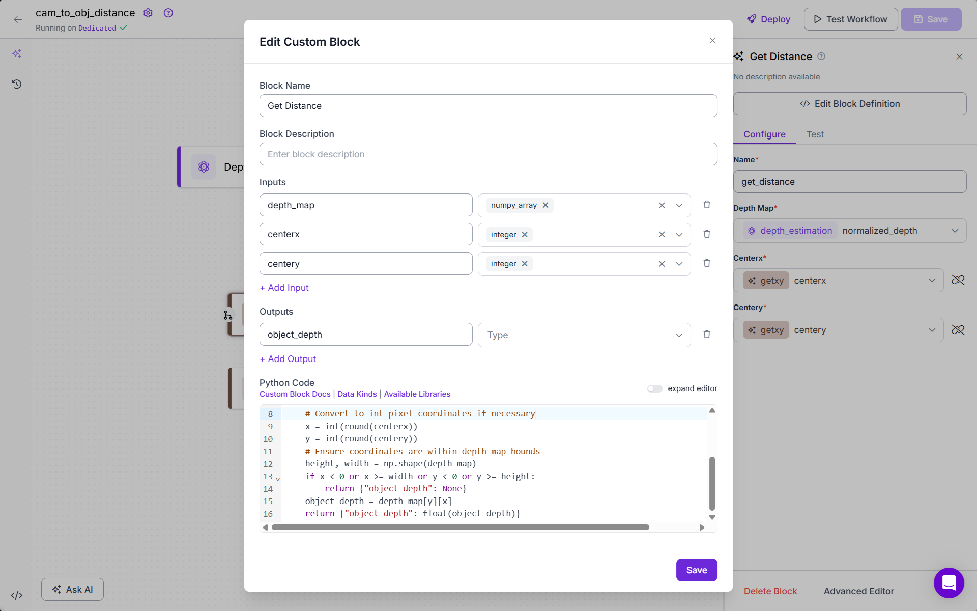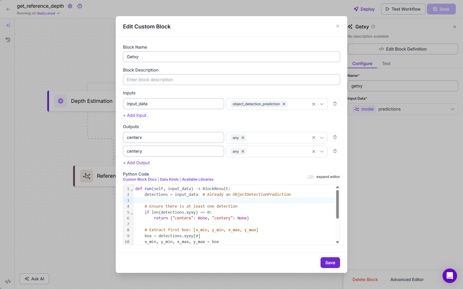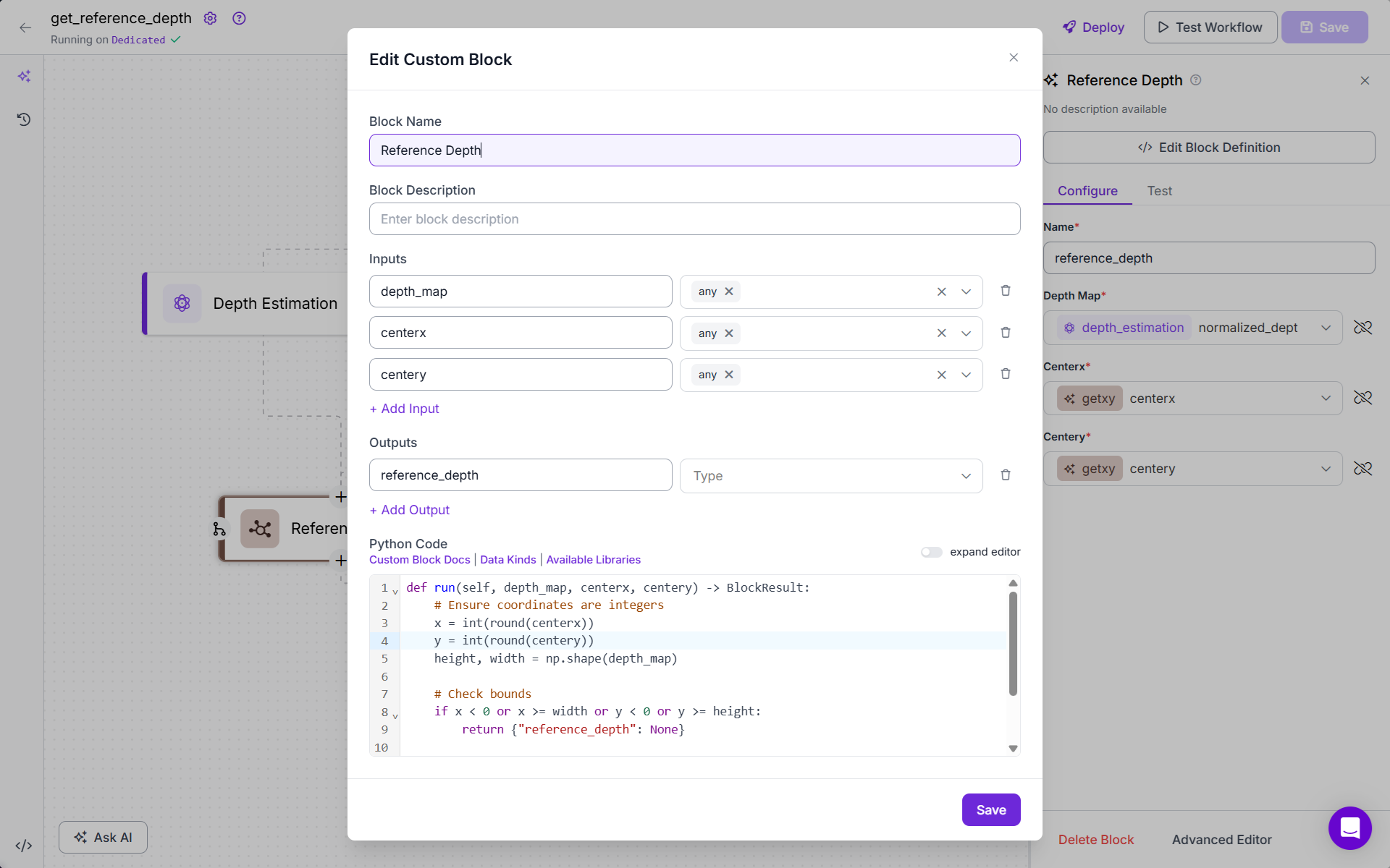 - Add the Reference Depth Block (Custom Python Code). This block looks up the depth value from the depth map using the center coordinates provided by Getxy. Following is the code for this block: