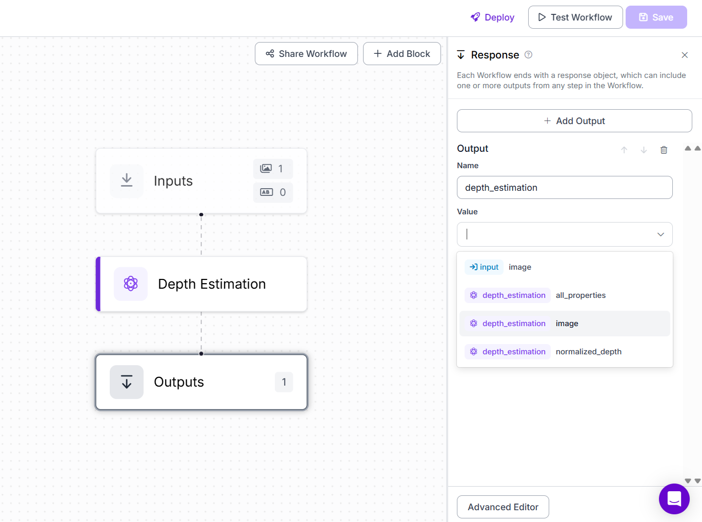 Using Depth Anything v2 on Roboflow Workflows is very simple. You just need to add Depth Estimation block as shown below.