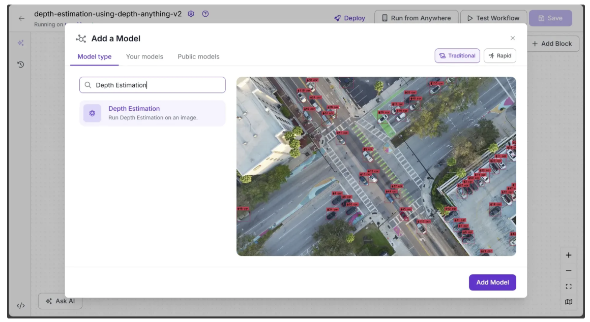 Now, add a Depth Estimation block to your workflow. This block lets your workflow run a depth estimation model without requiring you to set up the model yourself. To do this, click “Add a Model” in the workflow editor, search for “Depth Estimation,” and then click “Add Model.”