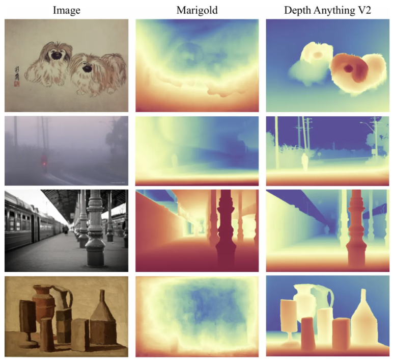 - Compared with recent models built on Stable Diffusion, such as Marigold, the Depth Anything V2 variants are significantly more efficient (over 10× faster), have fewer parameters, and achieve higher depth accuracy.