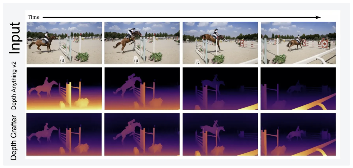 - DepthCrafter produces temporally consistent long depth sequences and outperforms Depth-Anything 2 on videos with intricate details in open-world scenarios, without requiring any supplementary information such as camera poses or optical flow.
