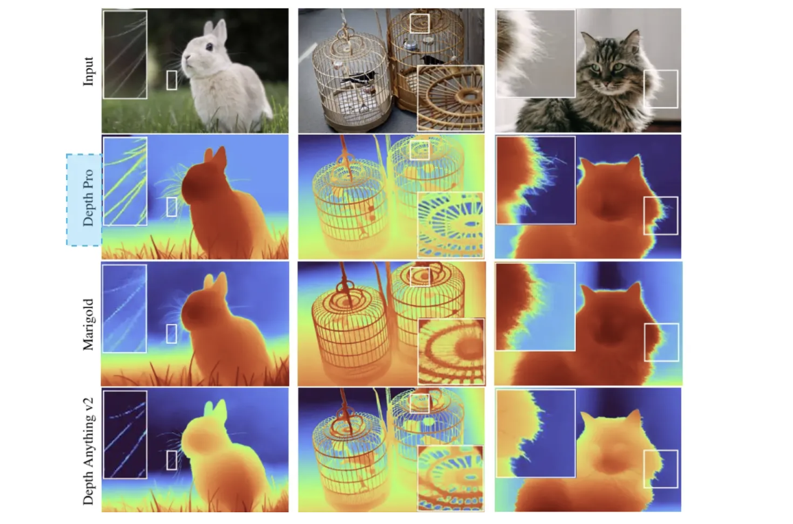 - Depth Pro generates depth maps at a native resolution of 1536×1536 in just 0.3 seconds on standard GPUs (e.g., V100).