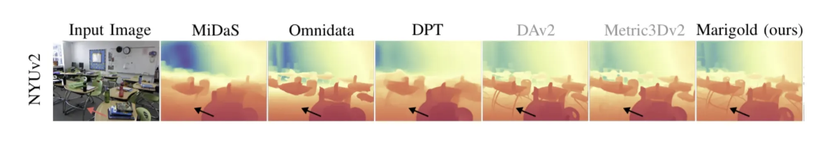 - NYUv2 is a large indoor RGB-D dataset, where Marigold v1.1 achieves 0.055 to 0.059 AbsRel and 0.961–0.964 δ₁, outperforming MiDaS and approaching Depth Anything V2.
