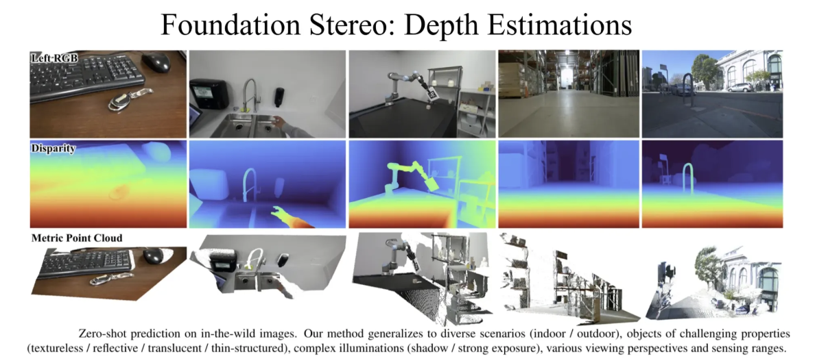 - FoundationStereo achieves strong zero-shot performance, generalizing to diverse unseen domains, including indoor, outdoor, and texture-challenged environments, without per-domain fine-tuning.