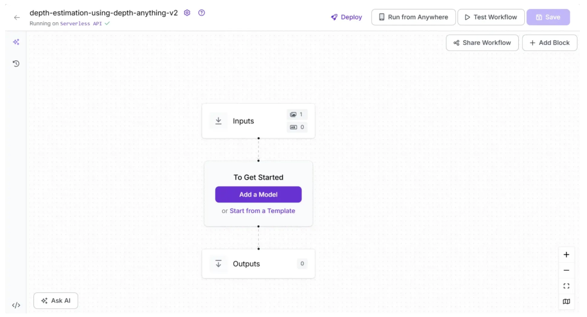 In the top left corner, you’ll see either Running on Serverless Hosted API or Hosted API. Both options support common tasks such as object detection, dynamic cropping, and chaining logic blocks, but neither can perform depth estimation. To include depth estimation support in your workflow, you’ll need a Dedicated Deployment or to self-host your own Roboflow Inference server.