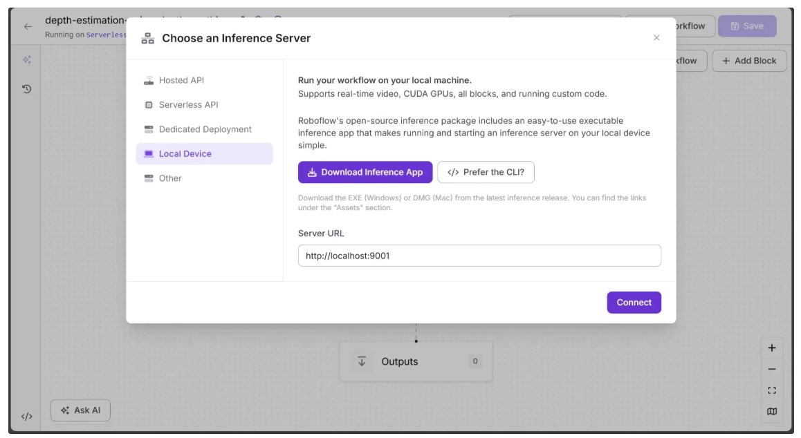Once the local inference server starts, you can verify it by visiting http://localhost:9001 in your browser and click Connect. After connecting, your workflow will run locally on your device.