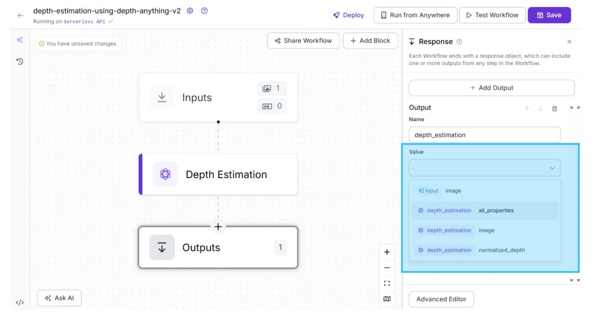To Configure the Output from the workflow utilizing Depth Estimation, click on the Outputs block as shown below: