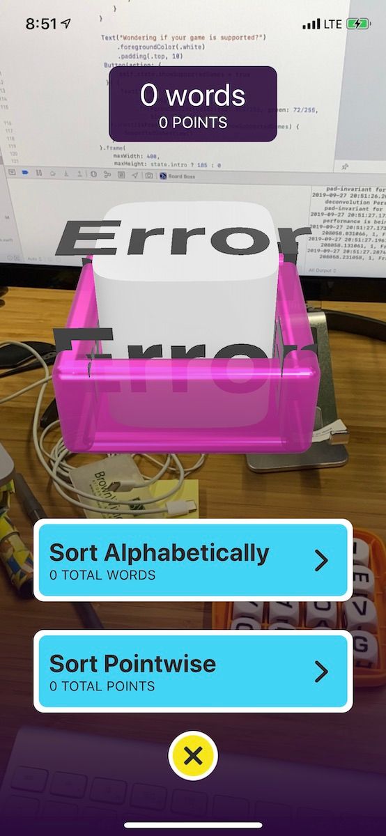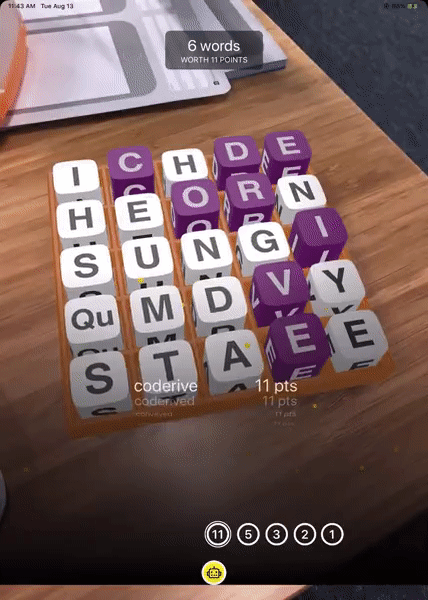 The main requirement was to use computer vision to scan the letters in the grid and provide a list of all possible words. I was still learning the capabilities of ARKit so, initially, I didn’t spend a lot of time designing the AR experience. I played it safe and designed a simple Boggle app that listed all the possible words, provided a 3-minute timer, and gave users the ability to enter their scores after each round.