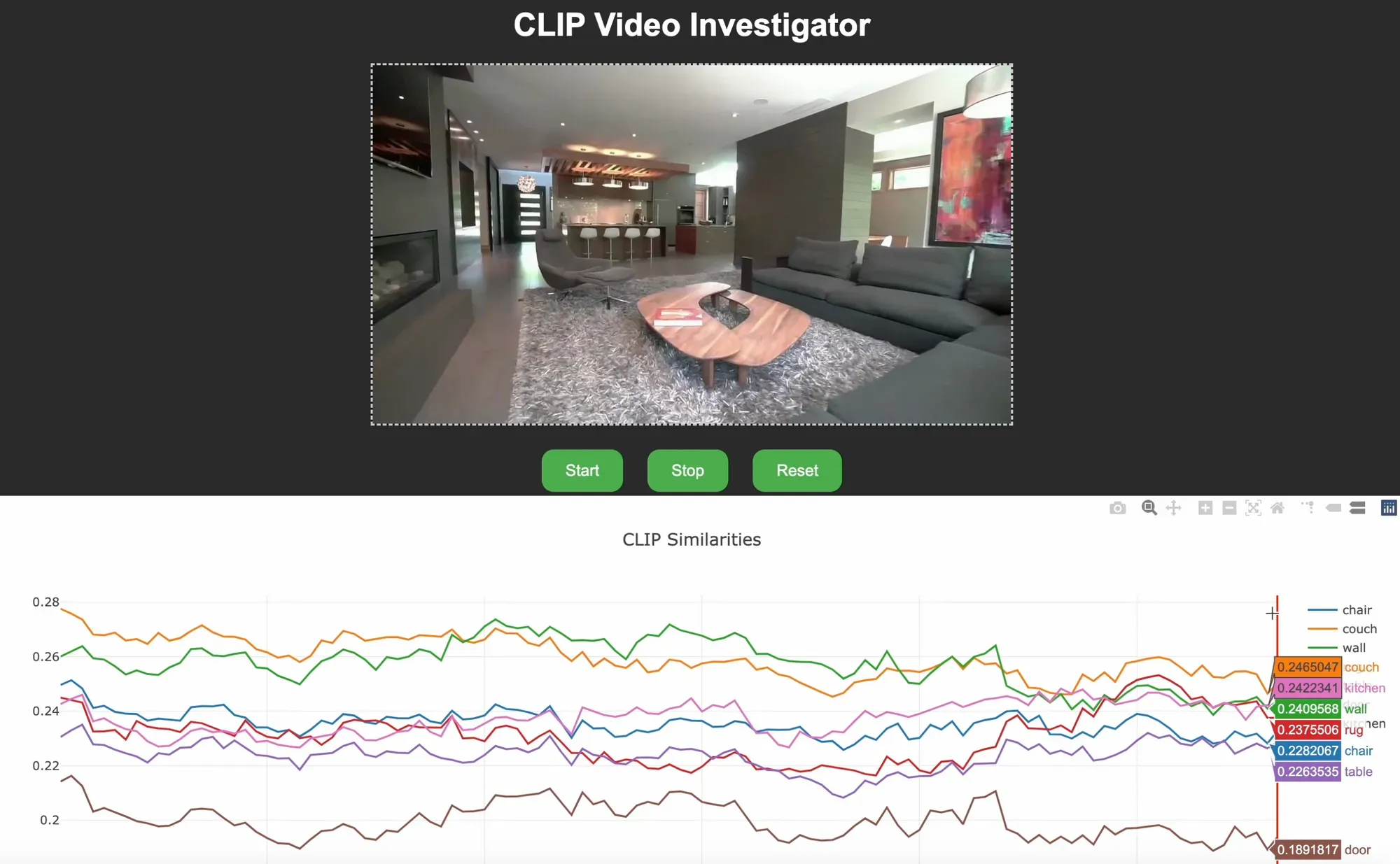 The below image shows the CLIP Video Investigator running on a video. The history of text prompts provided (i.e. "chair", "couch") are displayed on a graph below the video, allowing users to visualize, in real time, a video frame and how similar it is to each of the provided text prompts.