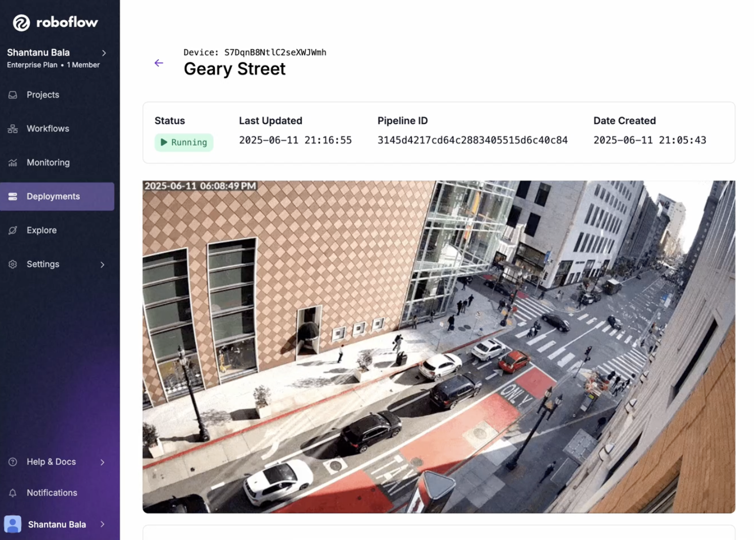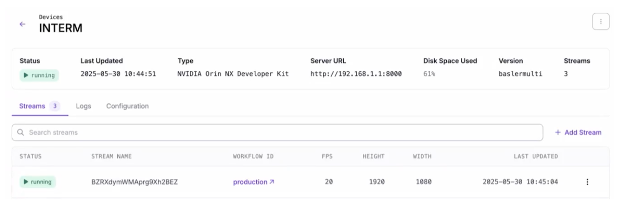 Once your device is set up, you can then add a Stream. A Stream is a camera feed on which you can run a Roboflow Workflow. See our documentation to learn how to add a video stream.