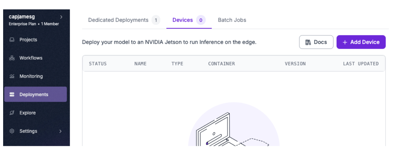 To get started with Device Manager, click “Deployments” in the right sidebar of the Roboflow web application. Then click “Devices”. You will see a page from which you can manage devices configured with Roboflow, and add new ones.