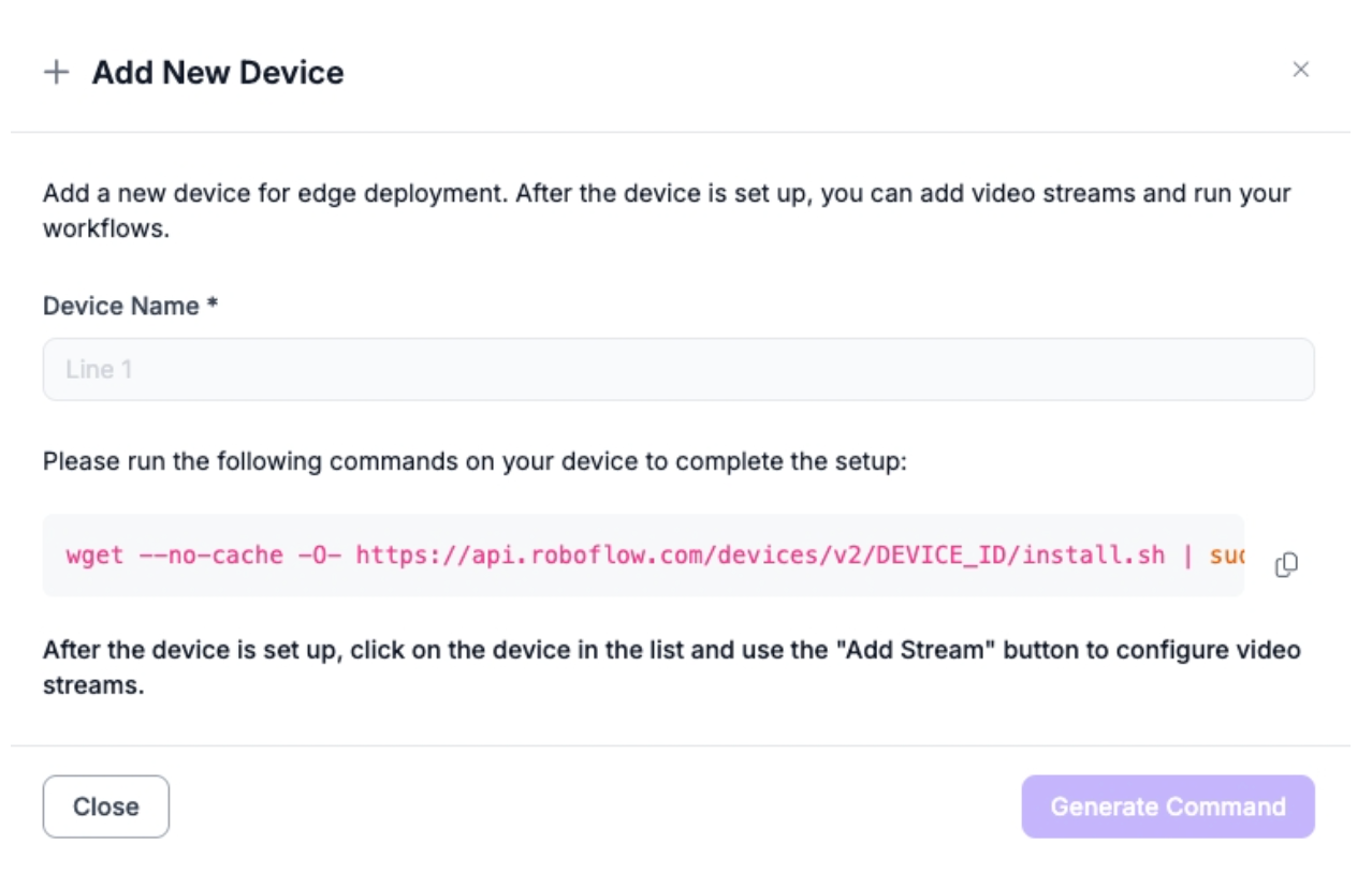With Device Manager, you can get all the dependencies you need to run a Roboflow Workflow on a device set up with a single script. The script will also register your device with the Roboflow web application so you can manage streams, run Workflows on streams, and see frames from streams.