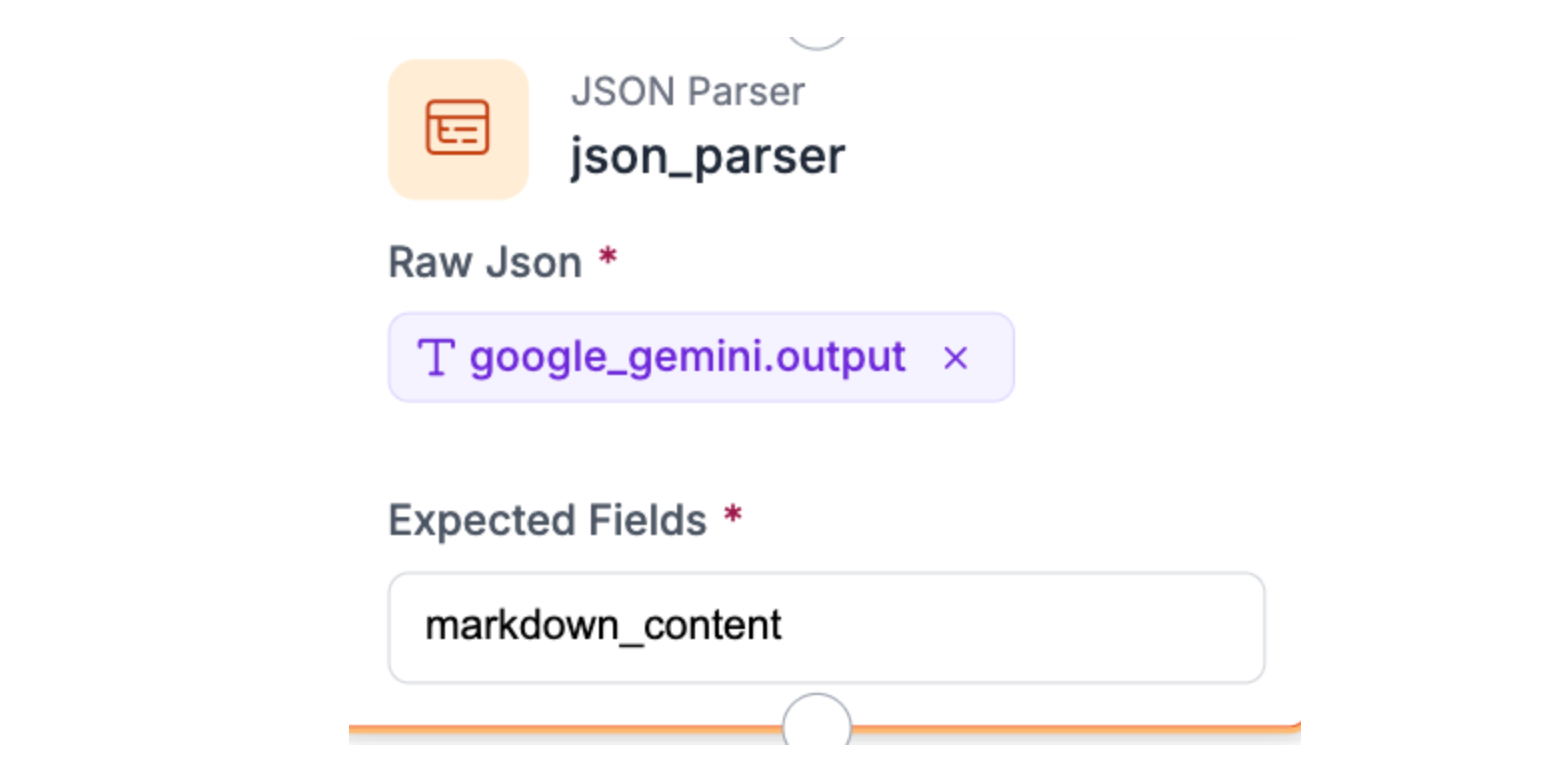 Connect the JSON Parser block to your Gemini output. Set the Expected Fields to `markdown_content`. This extracts the markdown text from Gemini's JSON response and validates the structure. If Gemini returns malformed output, the parser catches it here rather than breaking downstream processes. Simple, but critical for reliability.