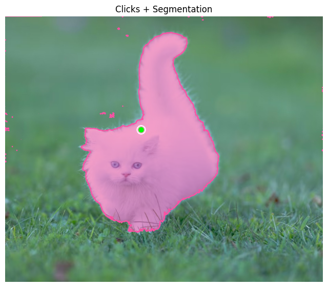 plt.show()Now, draw clicked points (green for positive, red for negative) on top of the segmented image so you can visually see where you clicked along with the segmentation result. The output will be similar to folowing.