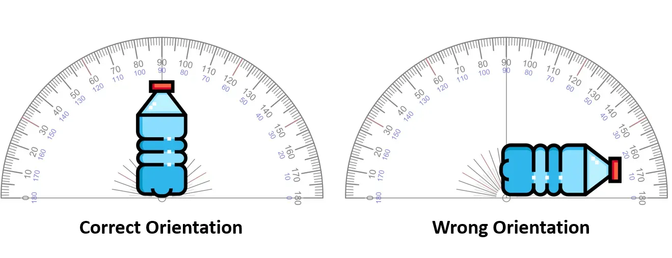 For example, if you place a water bottle on a table and it's perfectly upright with its base parallel to the table surface, its orientation would be considered 90 degrees. If you then tilt the bottle slightly to the left or right, its orientation would change accordingly.