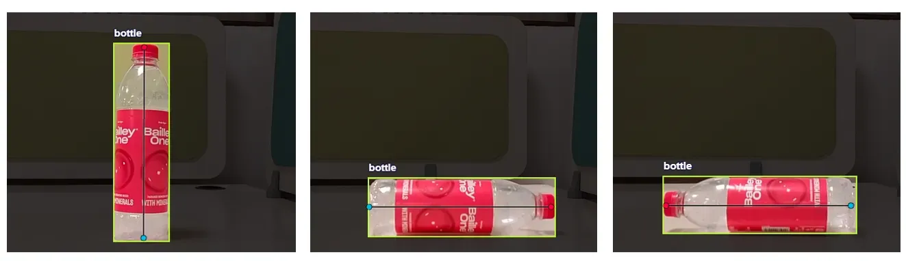 This information is used to estimate the orientation of object, a water bottle with top and bottom keypoints in our example. If the bottle is upright with its base, registering an angle of 90 degrees, it indicates correct orientation; otherwise, it's deemed incorrect.