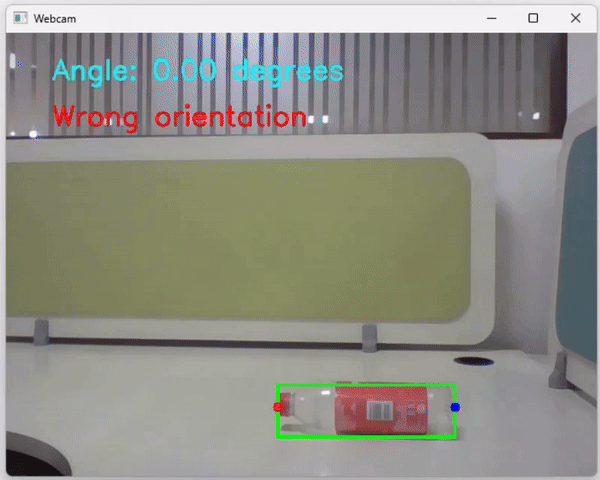 In computer vision or robotics contexts, determining the orientation of a water bottle might involve measuring the angle at which it's tilted or rotated from a predefined reference direction. This information can be useful for various applications such as object detection, manipulation, or tracking in automated systems.