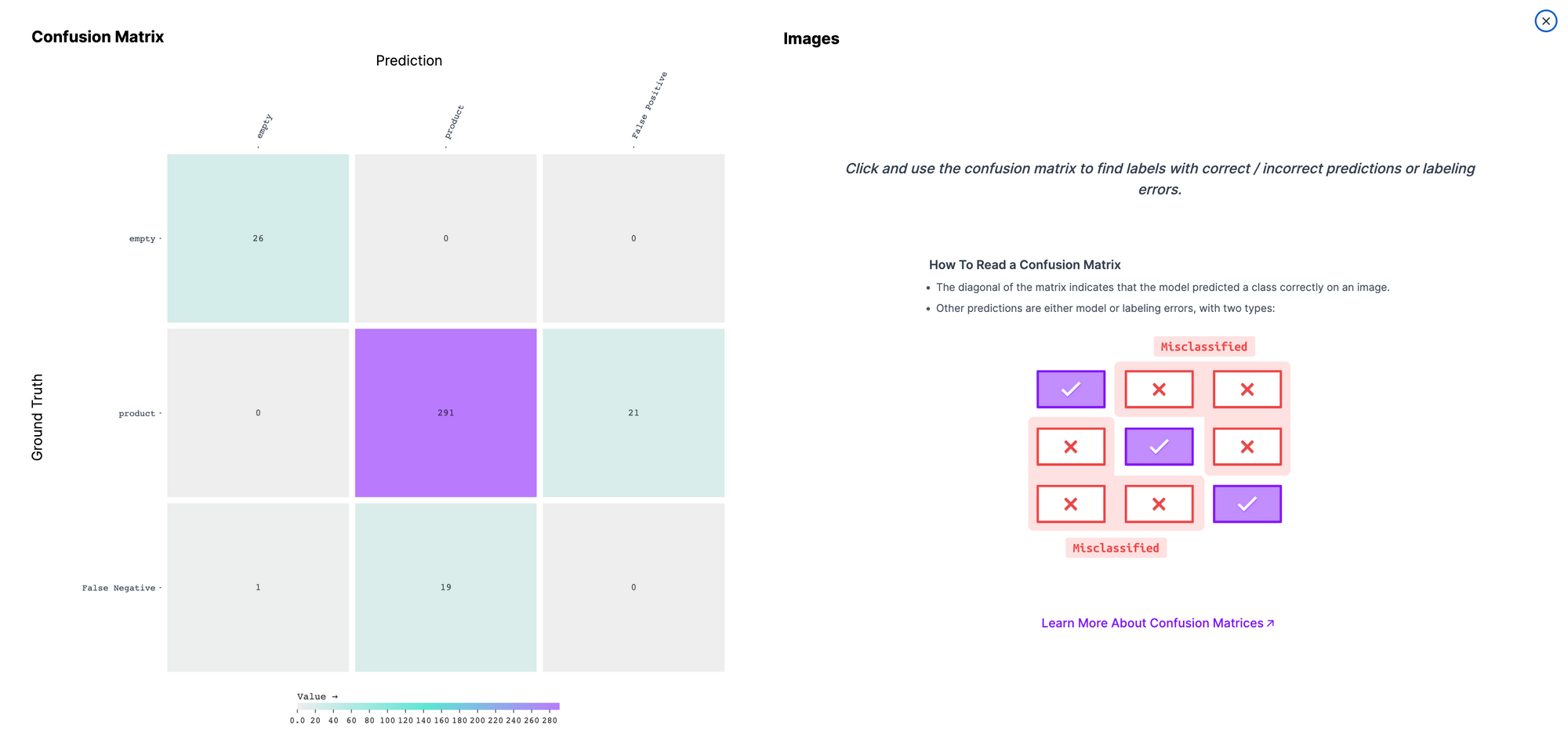 We can give deeper into the results of our evaluation by clicking on any square in our confusion matrix. This will open up a window in which we can view images in which our model misclassified an object and the images where our model correctly identified objects.