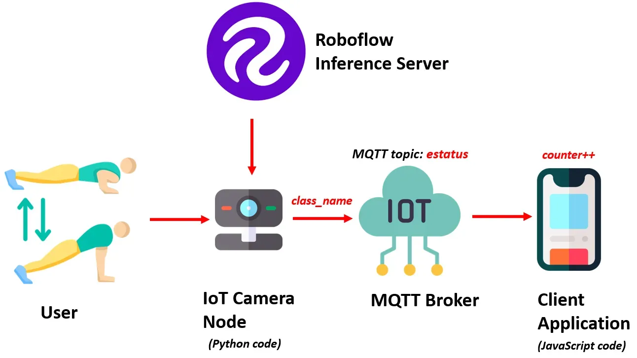 Using either Jetson Nano or Raspberry Pi, an IoT camera node uses a custom-built model from the Roboflow inference server to classify exercise poses. The result, extracted from the class_name variable, is then published to the MQTT topic estatus on the MQTT Broker.
