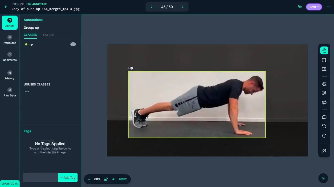 Each image has been labelled using bounding boxes to distinguish between the two classes: 'up' and 'down,' representing the 'push-up' and 'push-down' states of the pose, respectively.