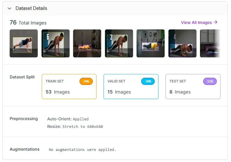 The image dataset for the push-ups exercise, encompassing the previously mentioned two distinct states, was collected manually, and uploaded to the Roboflow platform for labelling.
