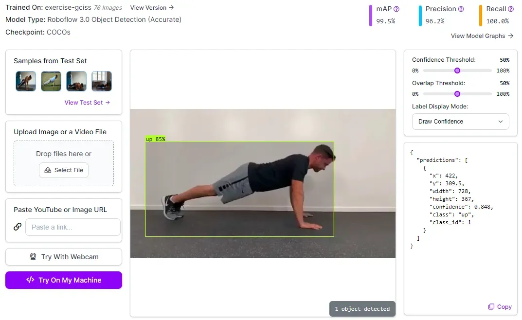 With the help of object detection results from our computer vision model, the project accurately extracts information about the exercise poses and publishes the results of the detected pose on an MQTT broker over the internet JavaScript logic is used to calculate the pose counts. These counts are displayed on a web interface
