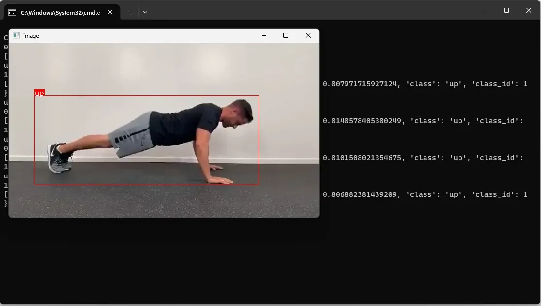 client.publish("estatus", class_name) # publish detected class to MQTT BrokerThe updated infer() method from Roboflow code repository detects and classifies the exercise pose based on the trained model. The detected class stored in the class_name variable, which is sent to the MQTT broker. Running the Python code displays the following output: