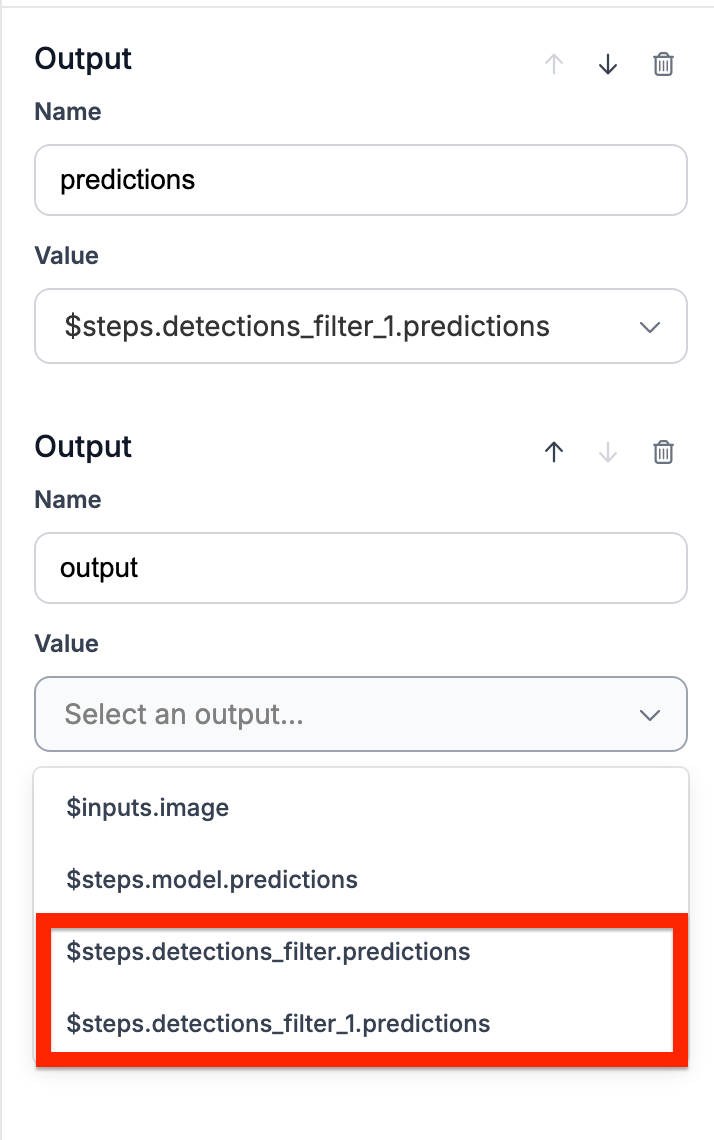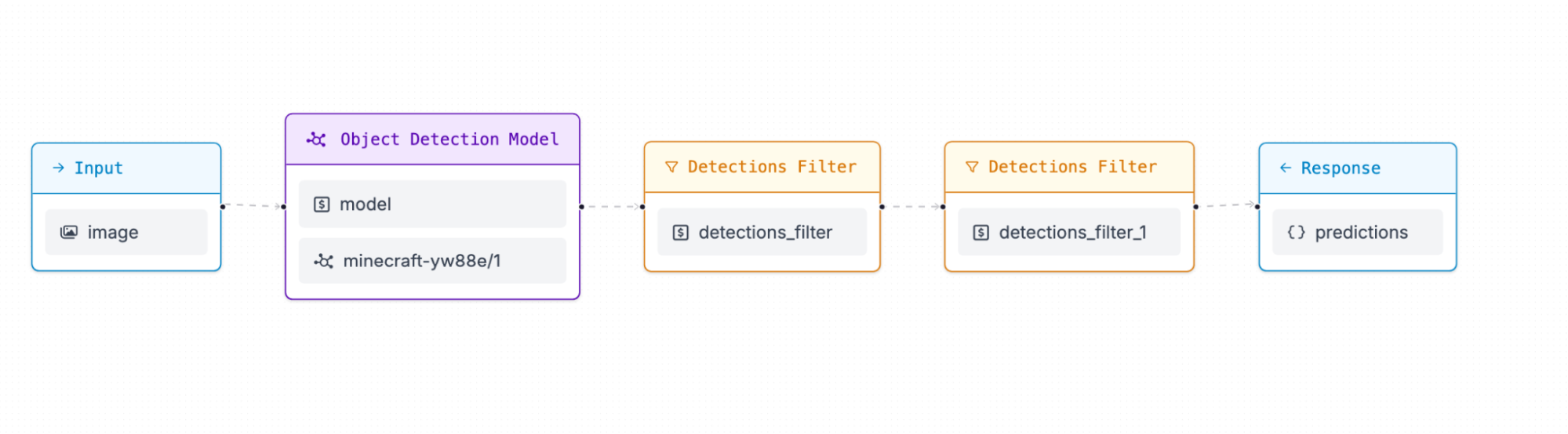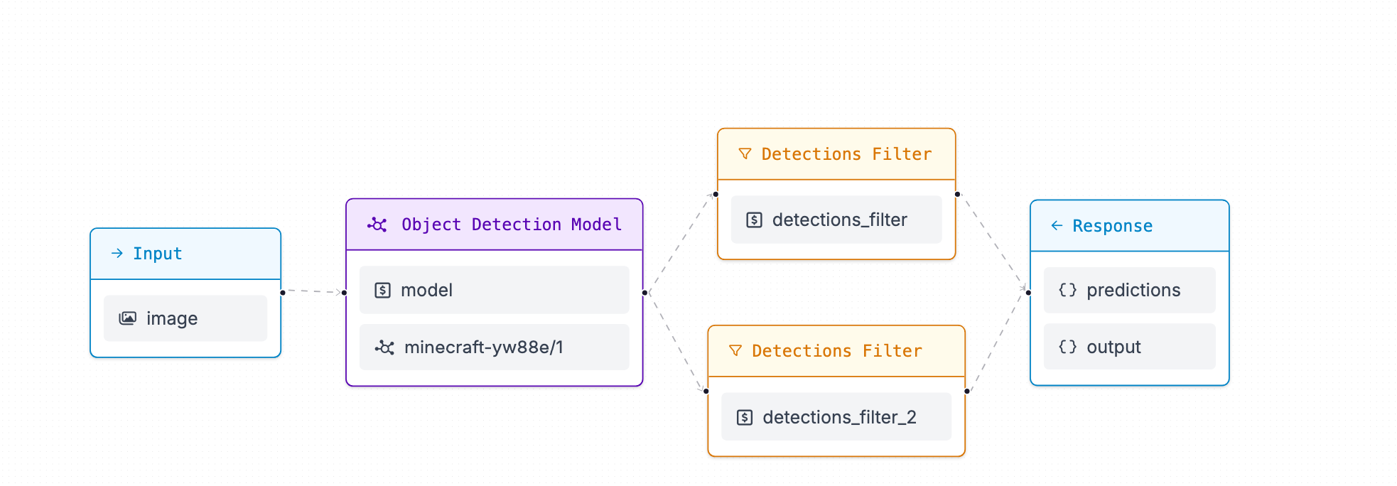 However, this is not what we want. We need to have the two detections filters connect on the object detection model and have both be an output. In order to change this, click into the second detections filter and change the reference input to be the model instead.