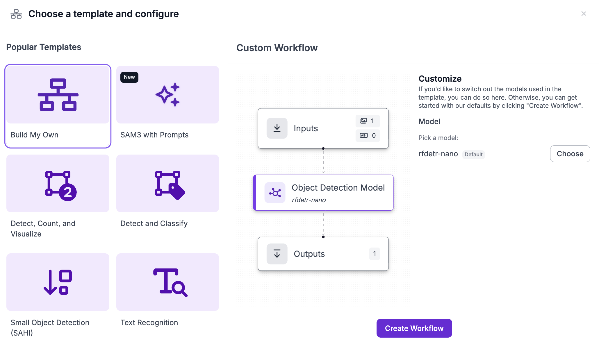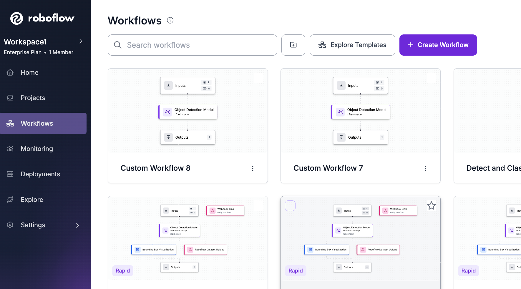 Next we’ll build a workflow with Claude using Roboflow. Head over to Roboflow, and log in/create an account. From there, create a workspace, and enter the Workflows tab: