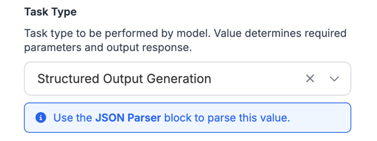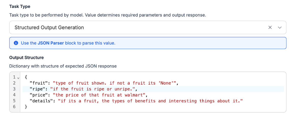 In the Anthropic block settings, change the task type to Structured Output Generation: