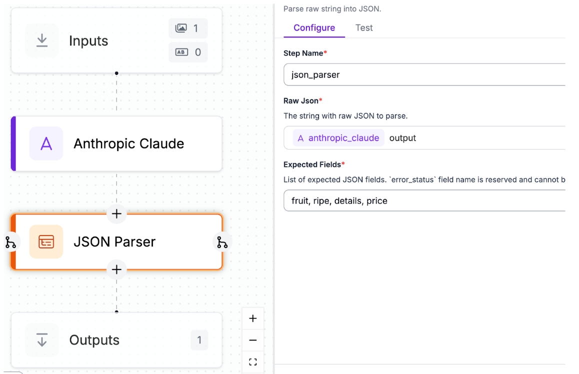 Next, to be able to use these results effectively, we need to add a JSON Parser block to the workflow, that will give a formatted JSON/dictionary of the values we wanted: