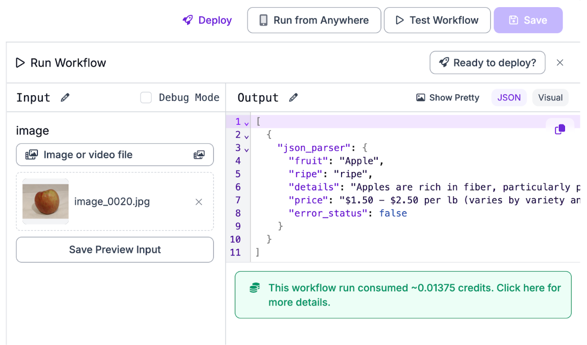 Before deploying, it’s beneficial to test the workflow on images so that we can be sure that there’s no errors and we’re getting exactly what we expected. Heading over to the testing tab in the workflow, you can upload an image of fruit and examine the outputs: