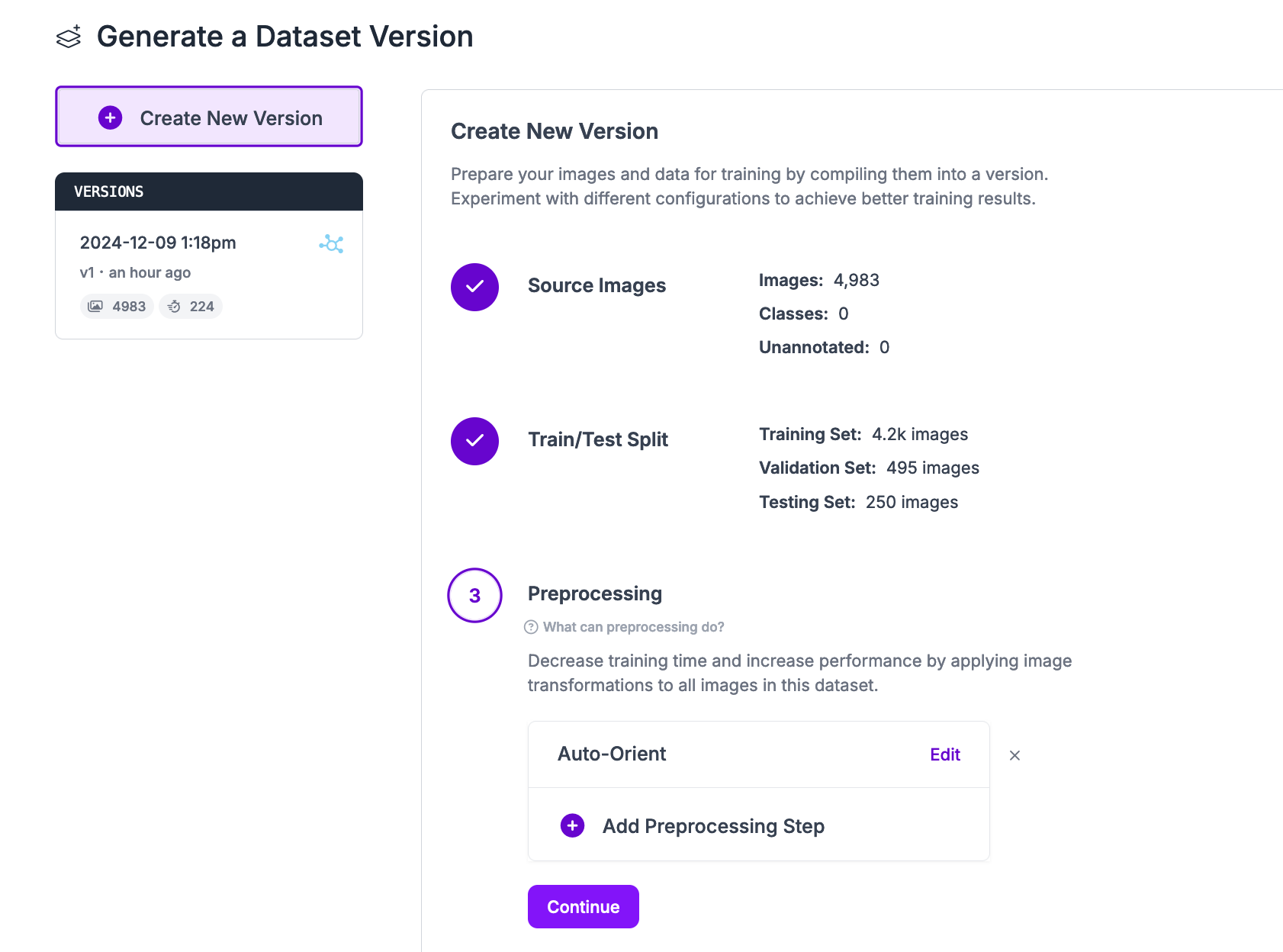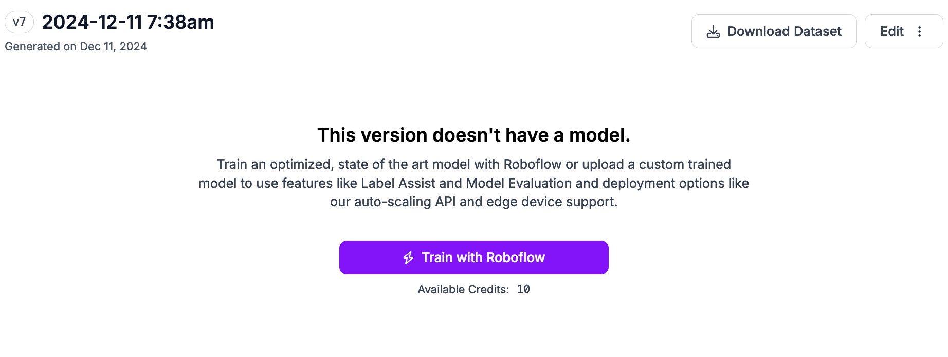 Click “Generate” at the bottom of the page to generate a multimodal dataset version. Your dataset will be prepared for use in training. The amount of time this process takes depends on the number of images in your dataset.