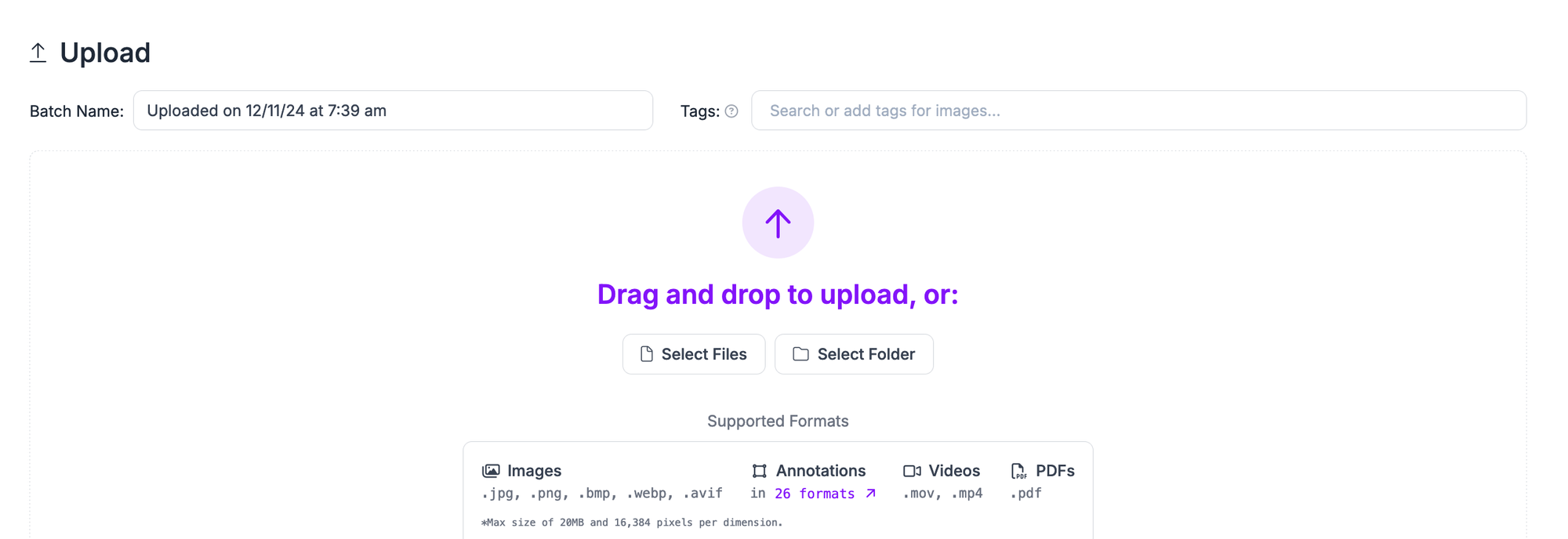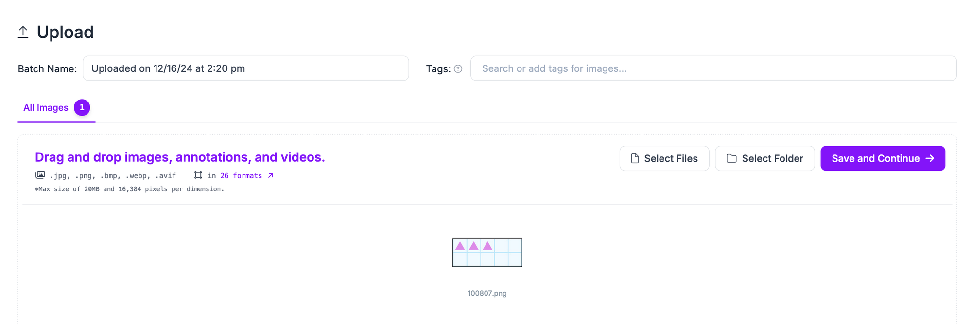 Drag and drop the images you want to label for use in training your model. Once your data has been processed in the browser, click “Save and Continue” to upload it to Roboflow.