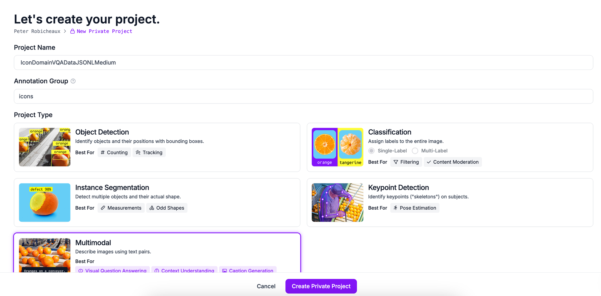 To get started, first create a Roboflow account. Then, click "Create New Project" on your Roboflow dashboard. Set a name for your project. For the task type, select "Multimodal."
