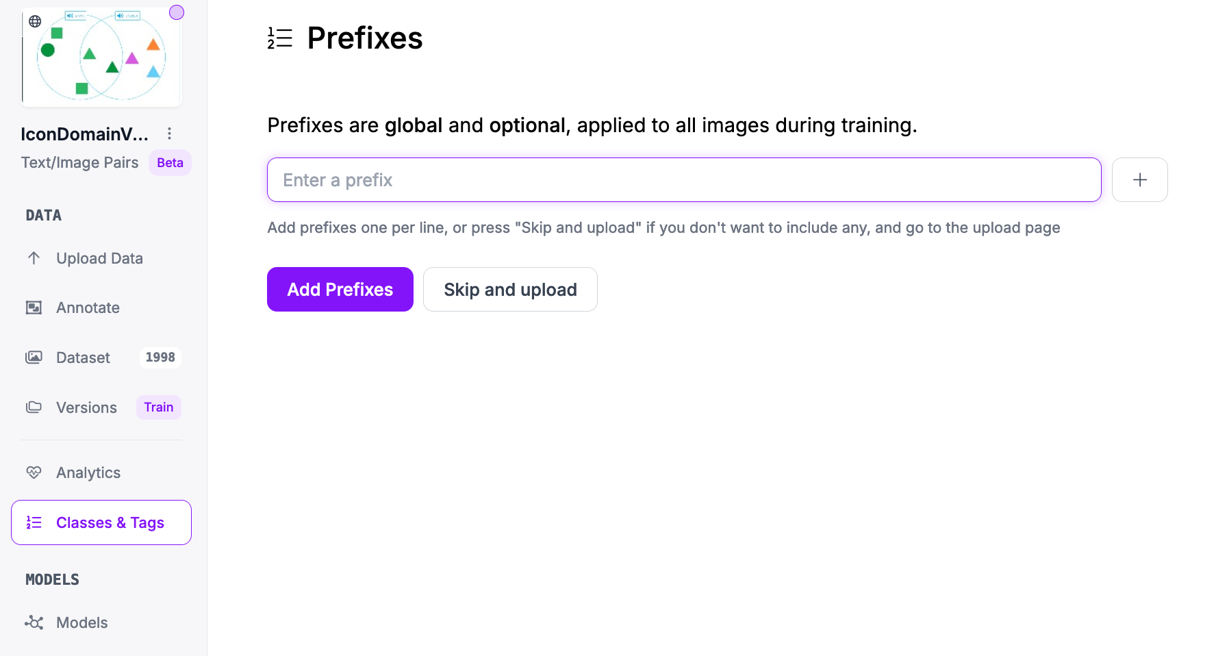 With a new project ready, you can configure the prefixes you want to use for training. Prefixes are used to prompt multimodal models.