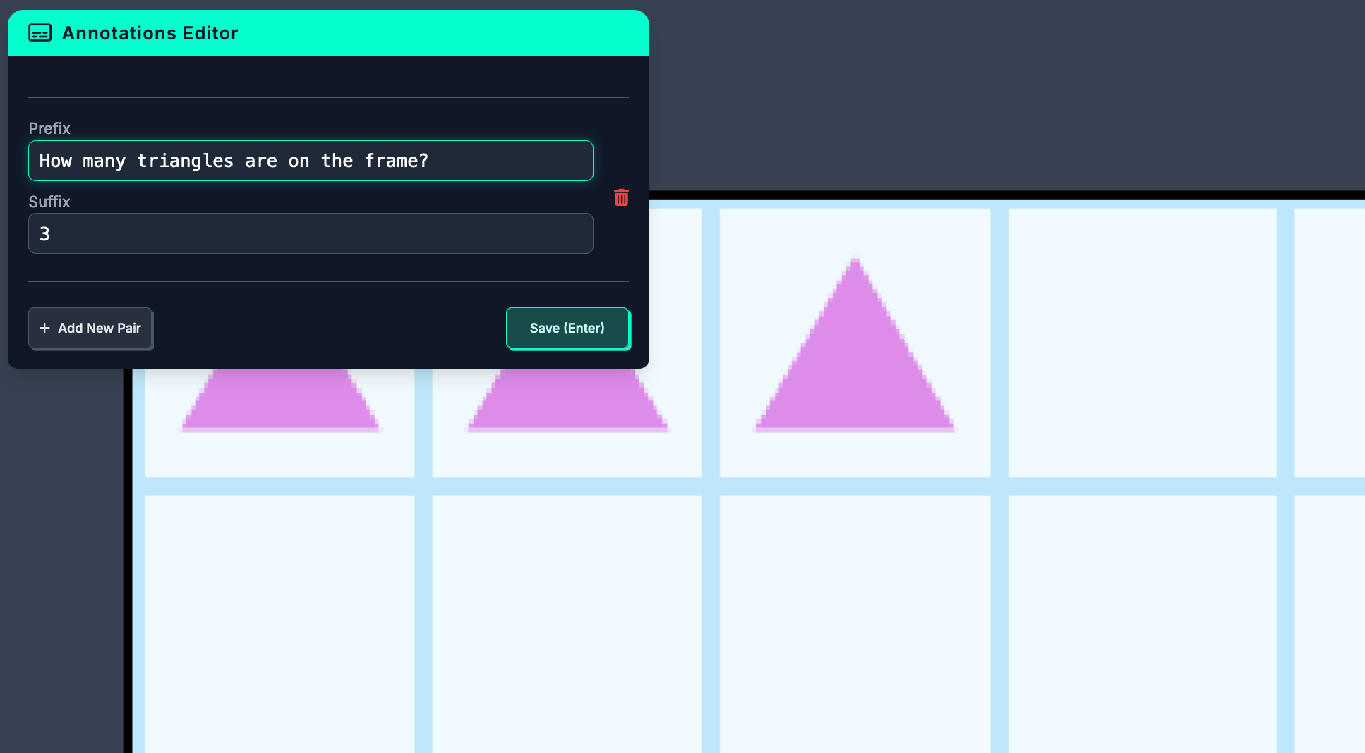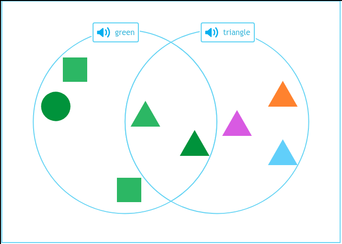 We are going to train a model on a VQA task that involves counting shapes in an image. By the end of this guide, we will have a model that can correctly identify that there are five green shapes in the image below: