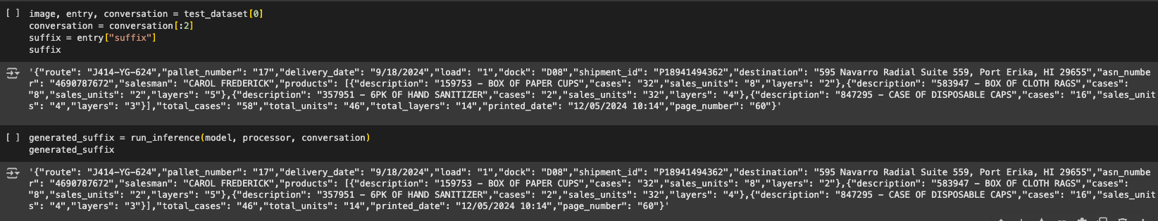 'text': '{"route": "Z833-QB-702","pallet_number": "5","delivery_date": "3/24/2024","load": "1","dock": "D04","shipment_id": "P49270667963","destination": "08811 Rosario Pike, New Michaelhaven, SD 13213","asn_number": "8219471036","salesman": "SHAUN MORGAN","products": [{"description": "123456 - CASE OF PAPER TOWELS","cases": "64","sales_units": "16","layers": "4"},{"description": "182845 - CASE OF BUCKETS","cases": "2","sales_units": "16","layers": "5"},{"description": "951753 - BOX OF PLASTIC WRAP","cases": "8","sales_units": "8","layers": "4"},{"description": "495867 - 6PK OF HAND TOWELS","cases": "4","sales_units": "64","layers": "4"}],"total_cases": "78","total_units": "104","total_layers": "17","printed_date": "12/05/2024 11:30","page_number": "71"}'}]}])Here, we can see that for the image in the train dataset, its provided the instructions (SYSTEM MESSAGE).