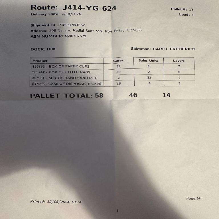 'suffix': '{"route": "Z833-QB-702","pallet_number": "5","delivery_date": "3/24/2024","load": "1","dock": "D04","shipment_id": "P49270667963","destination": "08811 Rosario Pike, New Michaelhaven, SD 13213","asn_number": "8219471036","salesman": "SHAUN MORGAN","products": [{"description": "123456 - CASE OF PAPER TOWELS","cases": "64","sales_units": "16","layers": "4"},{"description": "182845 - CASE OF BUCKETS","cases": "2","sales_units": "16","layers": "5"},{"description": "951753 - BOX OF PLASTIC WRAP","cases": "8","sales_units": "8","layers": "4"},{"description": "495867 - 6PK OF HAND TOWELS","cases": "4","sales_units": "64","layers": "4"}],"total_cases": "78","total_units": "104","total_layers": "17","printed_date": "12/05/2024 11:30","page_number": "71"}'},