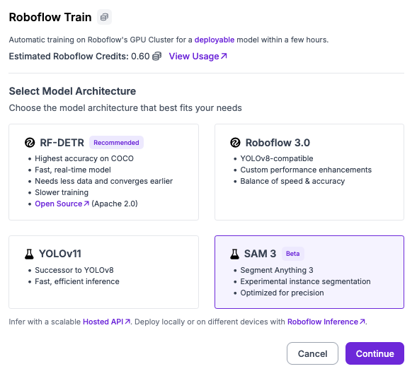 A window will appear with a selection of models from which you can choose for fine-tuning. For this guide, select “SAM 3”: