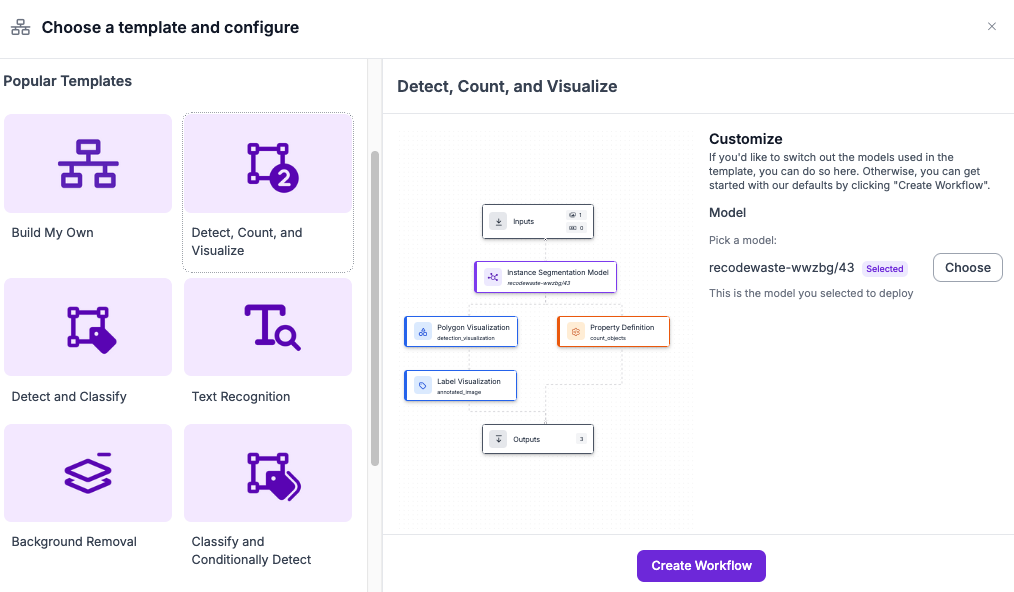 You will then be able to choose one of any of the several pre-built Workflow templates as a starting point for your SAM 3 deployment. Let’s choose the Workflow that will run our model, display the predictions, and count the number of detections for a given input image: