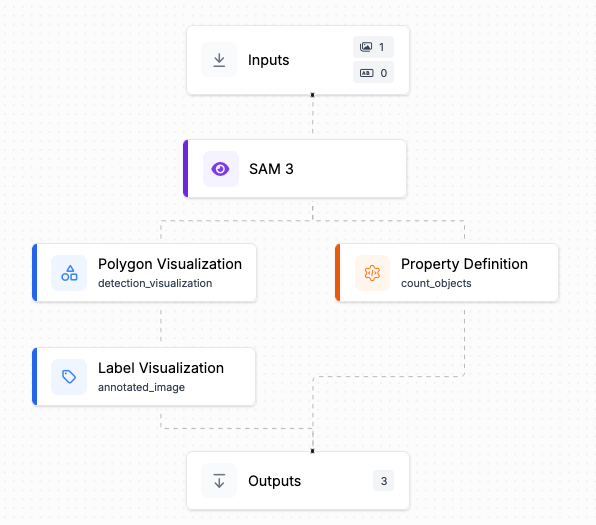 For this guide, we’ll build a Workflow that runs our SAM 3 model and displays the results. We will then deploy our model using the Roboflow Serverless API. Later in this guide, we will also discuss how to deploy your model on your own hardware with Roboflow Inference, our open source inference server.