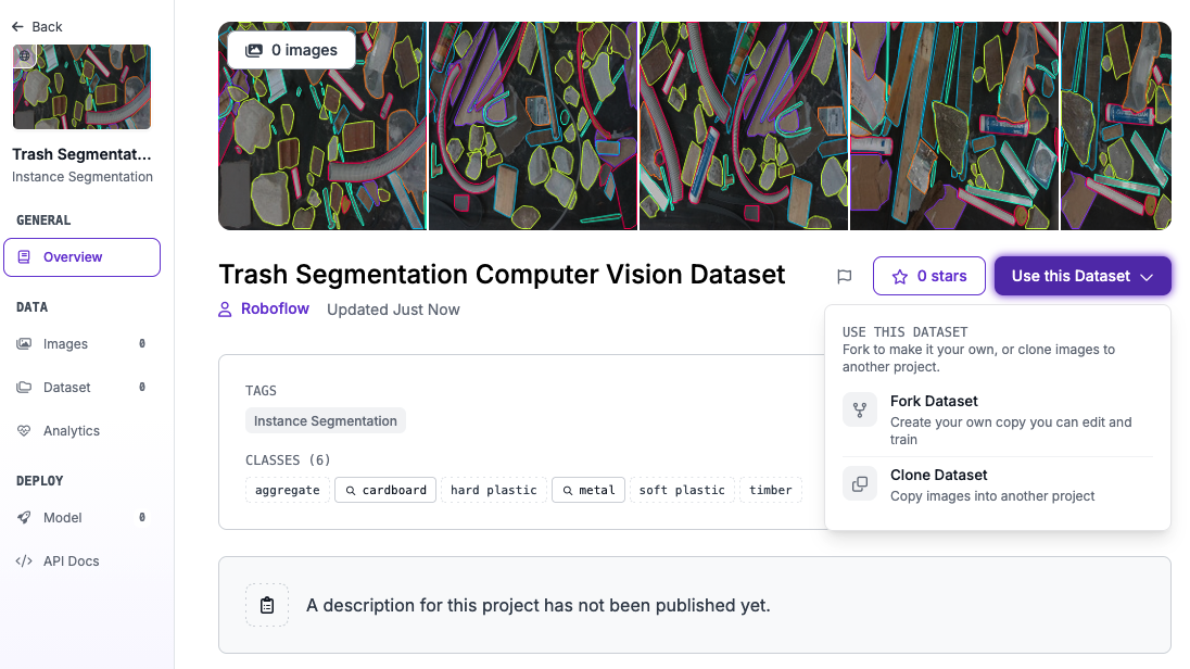 For this guide, we are going to use a dataset that identifies various different types of trash. This dataset is available on Roboflow Universe, the world’s largest repository of labeled computer vision data on the web. To follow along with this guide using our trash dataset, you can open the dataset on Roboflow Universe and click “Fork Dataset” to copy the dataset into your account.
