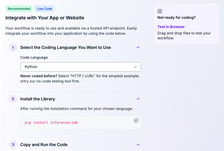 To deploy our SAM 3 Workflow, we can click “Deploy” in the top navigation bar within the Workflows editor. Choose Image as your input option, then choose the option to “Integrate with Your App or Website”. You will then see a code snippet you can use to call your cloud API that runs your SAM 3 Workflow: