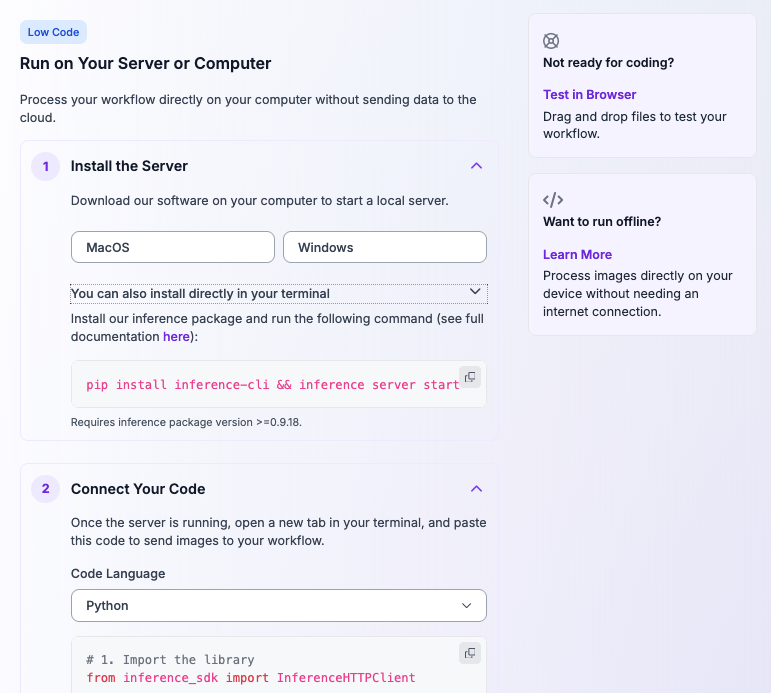 The server setup instructions ask you to set up a locally-running instance of Roboflow Inference, our open source computer vision inference server. You can do this with either our pre-packaged binaries or using your terminal. The instructions then provide a code snippet to call your local inference server.